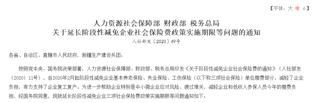 人力資源社會(huì)保障部 財(cái)政部 稅務(wù)總局關(guān)于延長(zhǎng)階段性減免企業(yè)社會(huì)保險(xiǎn)費(fèi)政策實(shí)施期限等問(wèn)題的通知人社部發(fā)〔2020〕49號(hào)各省、自治區(qū)、直轄市人民政府,新疆生產(chǎn)建設(shè)兵團(tuán):